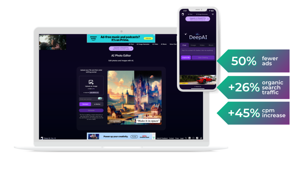 DeepAI set out to reduce its ad load by 50% to create a cleaner, more user-friendly experience across its site. Its aim was to strike a better balance between monetization and long-term audience growth, prioritizing user trust, engagement, and SEO over short-term gains. With a lean dev team and a focus on product, it needed a solution that was both effective and easy to execute.